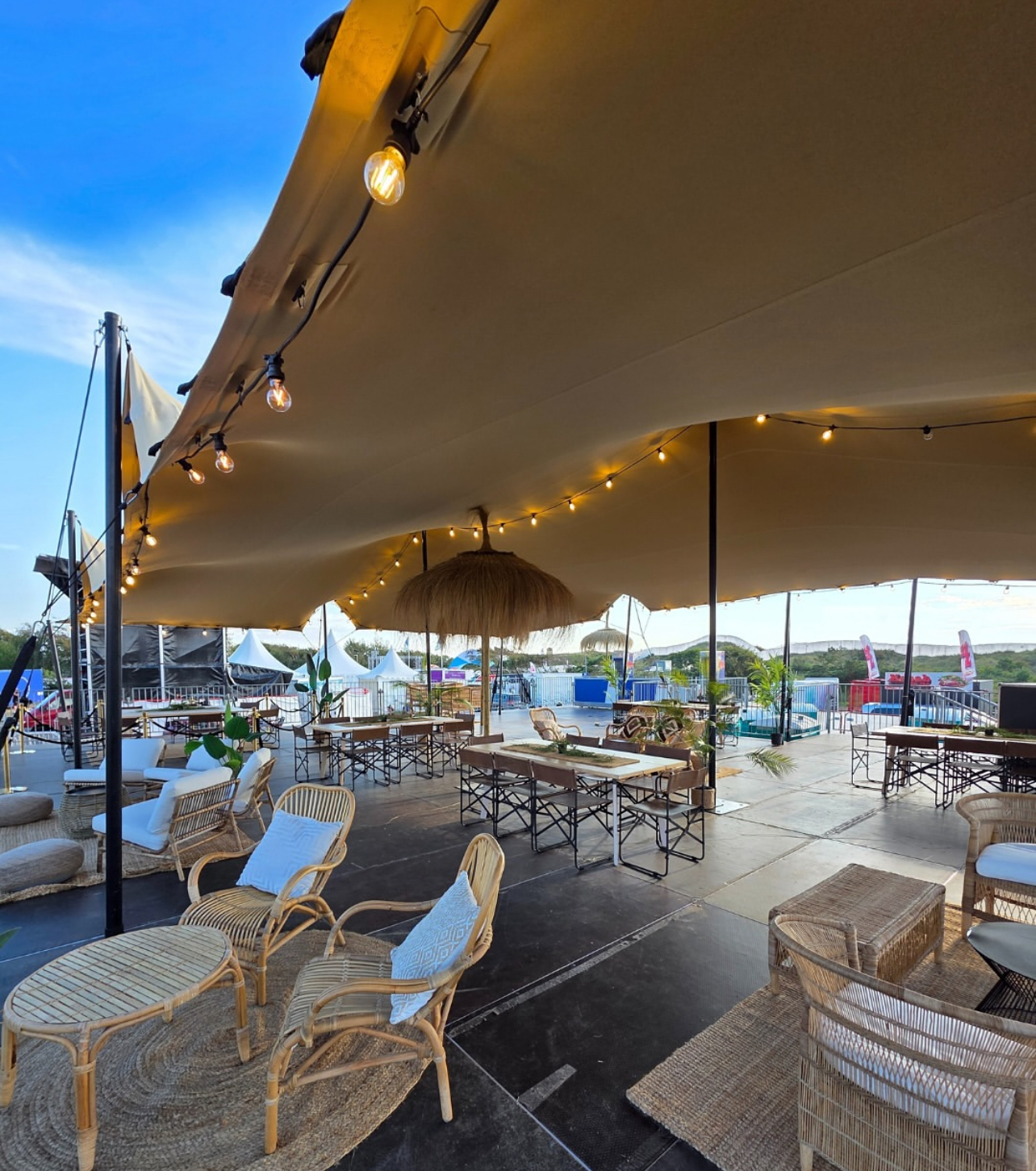 - Tendas Stretch: ideais para quem procura um ambiente com forte impacto visual, mais descontraído e integrado na paisagem, mantendo a funcionalidade e a proteção.